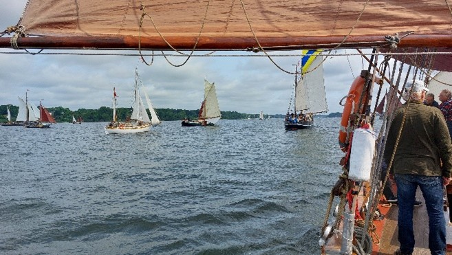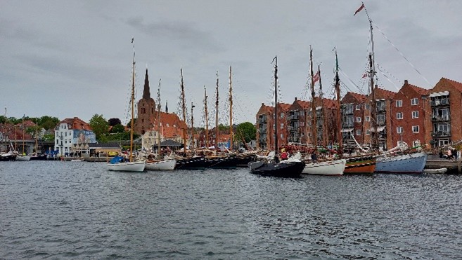 Da der Wind nach dem Ziel immer noch recht kräftig gegenan blies und die Nutzung der Maschine hier keinen Vorteil brachte, sind wir also tapfer weitergekreuzt und gegen 17:00 im Flensburger Museumshafen angekommen. Da durch den Hochwasserschaden an den Kaianlagen weniger Liegeplätze zur Verfügung standen, wurden die Päckchen nochmal eine Nummer größer, bis zu 8 Schiffe. Bewundernswert ist, wie die Skipper ihre Schiffe mit nur einer Hauptmaschine, ohne Bugstrahlruder, drehen und passgenau an ihren Platz bringen. Jeder hilft jedem und die Leinen werden zügig übergenommen und fest gemacht.