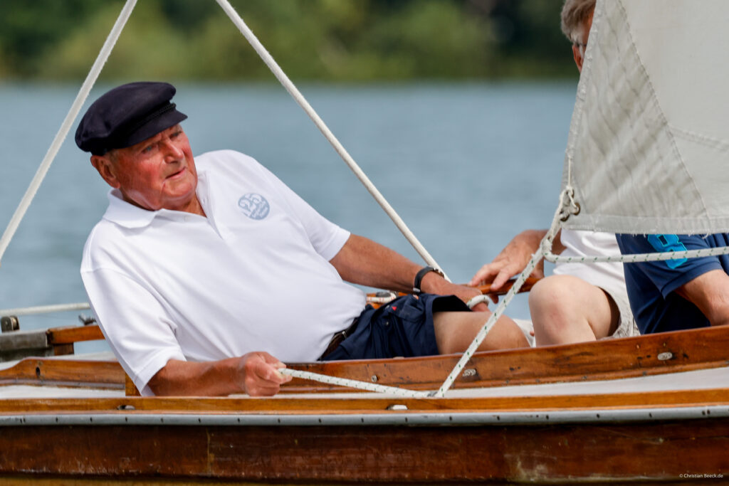 P.S.: Auf dem Foto unser langjähriges Club-Mitglied Alfred (Bahr) und einem Club-Shirt zum 125-jährigen Club-Jubiläum im August 2023 bei der Holzbootregatta auf der Wakenitz…