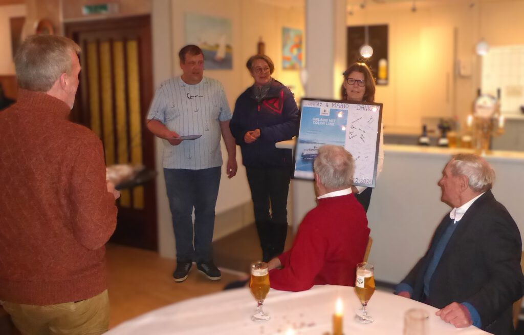 Im Rahmen einer Sammlung wurde ein Gutschein für einen Kurzurlaub mit der Color Line von Kiel nach und in Oslo organisiert. Andrea (Brunotte) und Volker (Riechert) überreichten das Geschenk mit ein paar persönlichen Dankesworten. Die anwesenden Mitglieder und Geburtstagsgäste schlossen sich mit langem Applaus an.